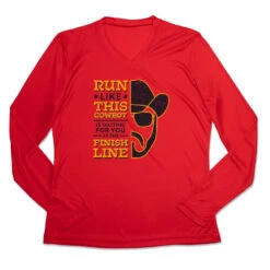 Show off your cowboy pride in our women’s long sleeve tech tee featuring our exclusive Finish Line Cowboy design. Our V-neck performance tee is made from 100% polyester interlock to keep runners dry and cool. The long sleeve tech tee offers a comfortable and relaxed fit that looks great with any choice of bottoms from leggings and athletic tights to jeans and longs. This stylish tech tee is perfect for everyday wear and an ideal running gift for any occasion.