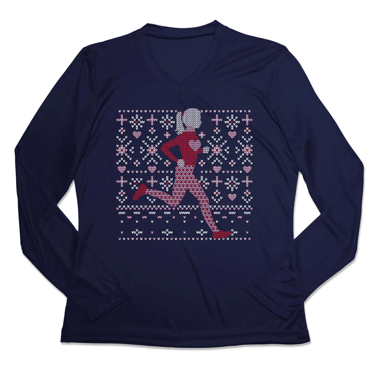 Show of your love for running in our women’s long sleeve tech tee featuring our exclusive Heart Sweater Run design. Our V-neck performance tee is made from 100% polyester interlock to keep runners dry and cool. The long sleeve tech tee offers a comfortable and relaxed fit that looks great with any choice of bottoms from leggings and athletic tights to jeans and longs. This stylish tech tee is perfect for Valentine’s Day celebrations, everyday wear and an ideal running gift for any runner girl.