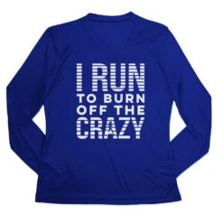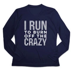 Women’s Long Sleeve Tech Tee – I Run To Burn Off The Crazy (White)