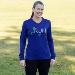 Show off your running pride in our women’s long sleeve tech tee featuring a one-of-a-kind bold design inspired by running. Our V-neck performance tee is made from 100% polyester interlock to keep runners dry and cool. The long sleeve tech tee offers a comfortable and relaxed fit that looks great with any choice of bottoms from leggings and athletic tights to jeans and longs. This stylish tech tee is perfect for everyday wear and an ideal running gift for any occasion.