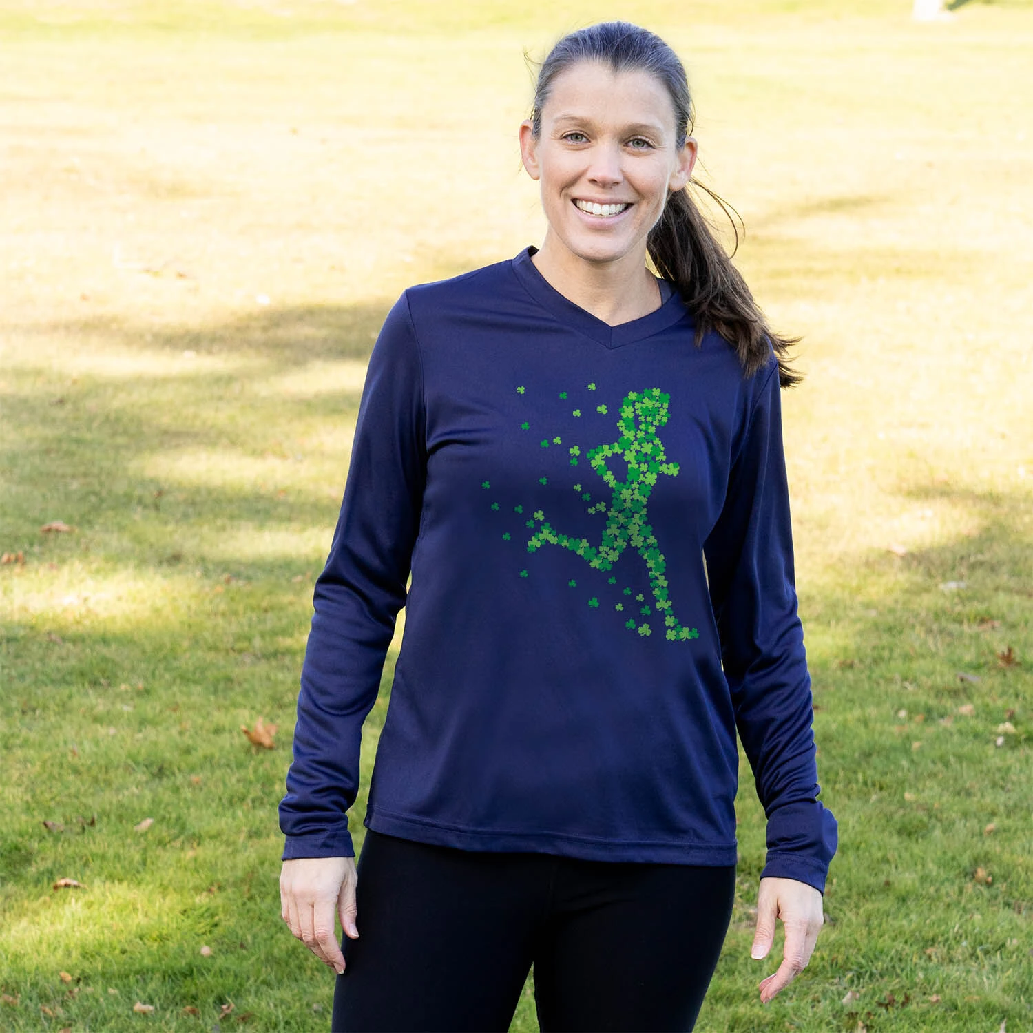 Celebrate St. Patrick’s Day in our women’s long sleeve tech tee featuring our exclusive Clover Girl design. Our V-neck performance tee is made from 100% polyester interlock to keep runners dry and cool. The long sleeve tech tee offers a comfortable and relaxed fit that looks great with any choice of bottoms from leggings and athletic tights to jeans and longs. This stylish tech tee is perfect for St. Paddy’s festivities, everyday wear, and an ideal gift for any runner girl.