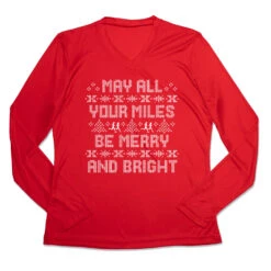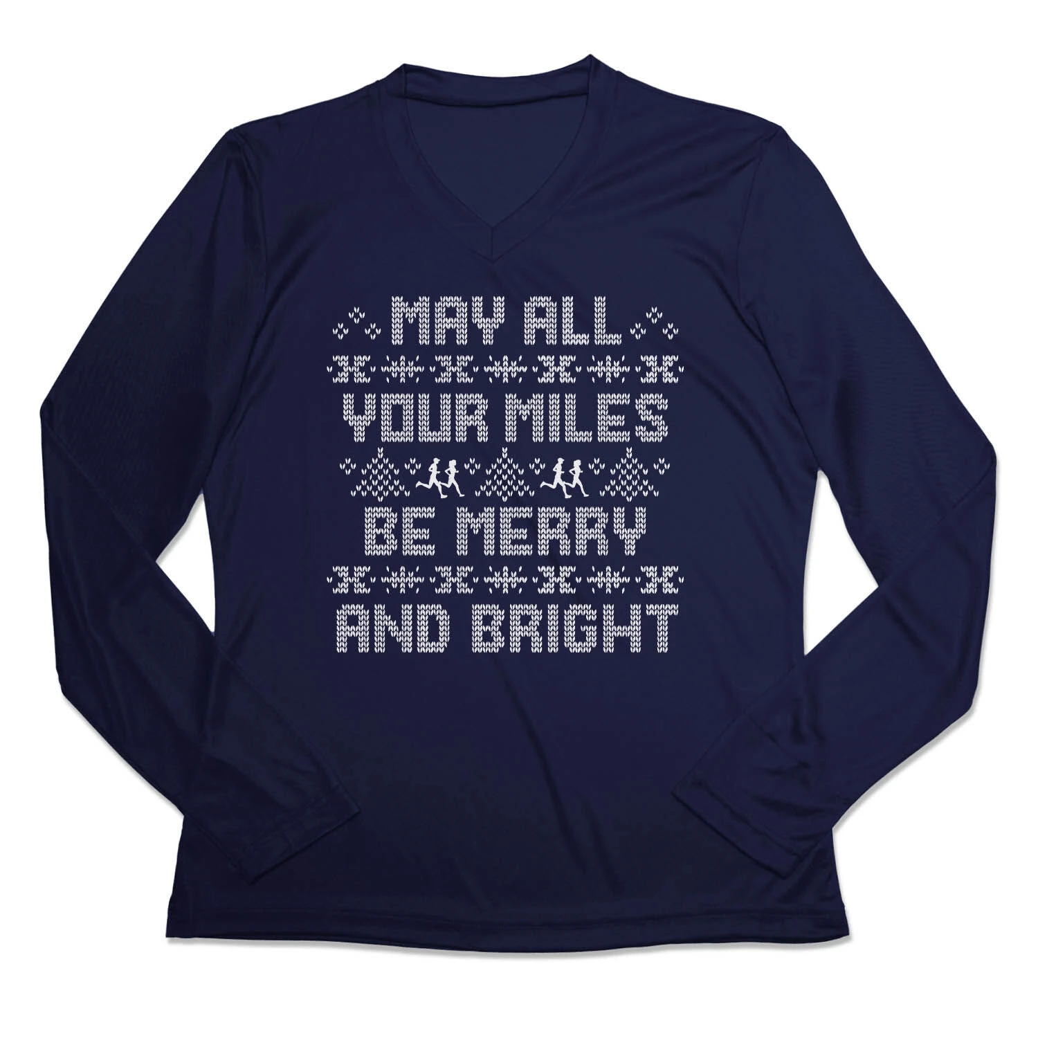 Get in the holiday spirit in our women’s long sleeve tech tee featuring a one-of-a-kind Christmas design inspired by running. Our V-neck performance tee is made from 100% polyester interlock to keep runners dry and cool. The long sleeve tech tee offers a comfortable and relaxed fit that looks great with any choice of bottoms from leggings and athletic tights to jeans and longs. This stylish tech tee is perfect for everyday wear and an ideal running gift for any occasion. Any runner would love this for any holiday race.