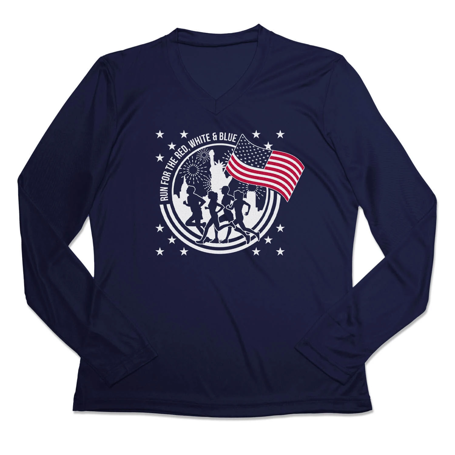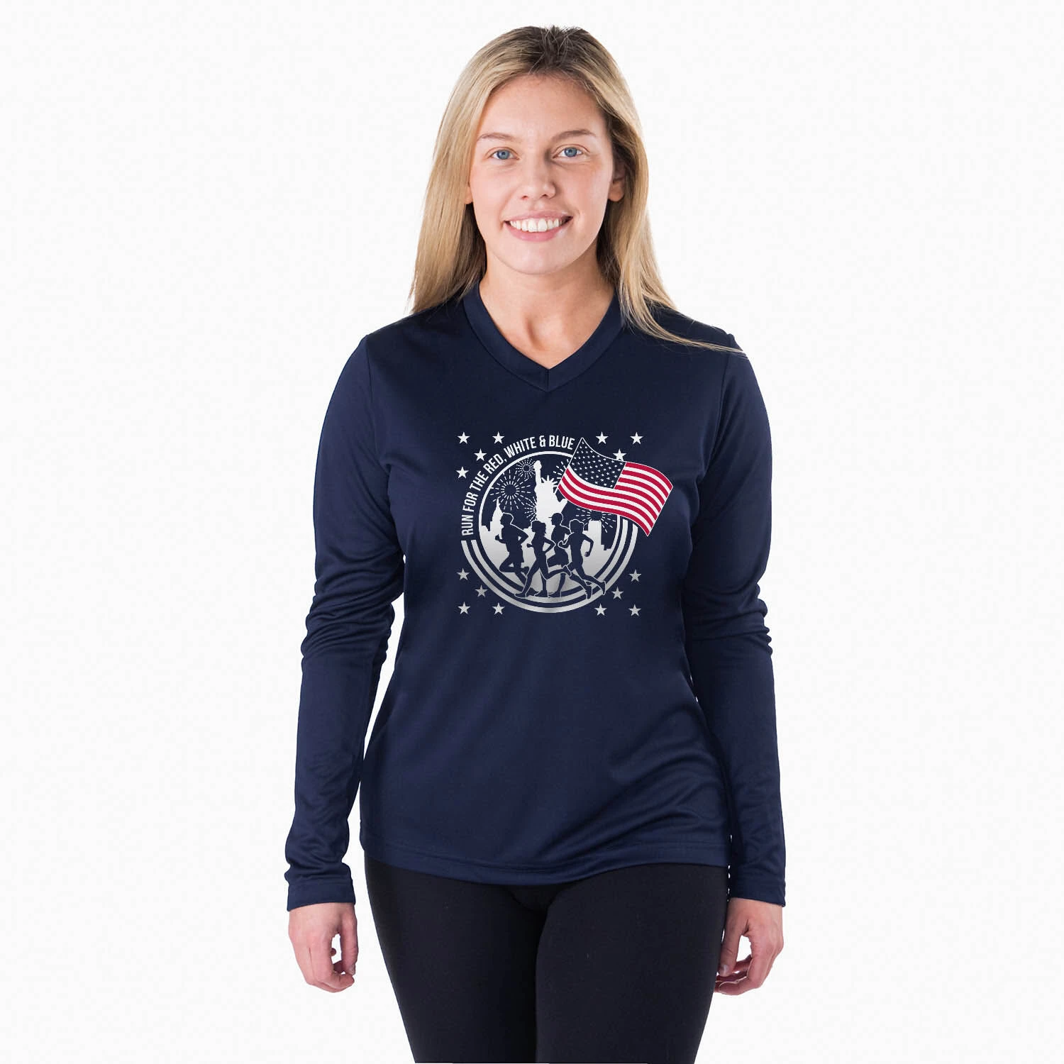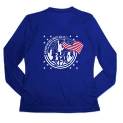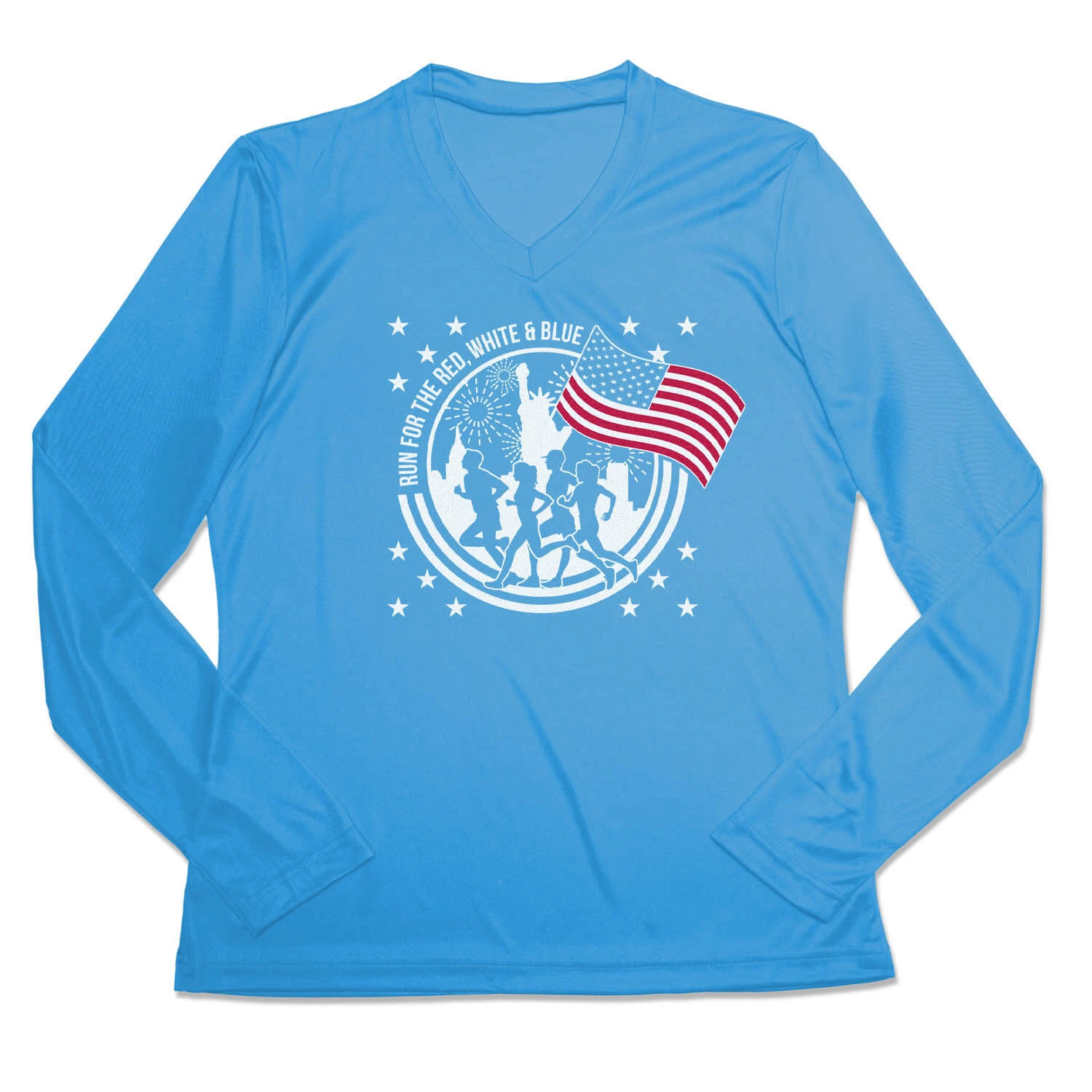 Show your love for your country and running with our women’s long sleeve tech tee – Run for the Red, White & Blue. This V-neck performance tee features an exclusive patriotic design and is made from 100% polyester interlock, ensuring runners stay dry and cool even during the toughest workouts. The relaxed fit of this long sleeve tech tee provides comfort and is versatile to wear with any choice of bottoms, whether it’s leggings, athletic tights, jeans, or sweatpants. This stylish tech tee is perfect for everyday wear and patriotic races or occasions like Memorial Day or the 4th of July. It’s an ideal gift for any female runner who wants to show off her passion for running and love for her country.