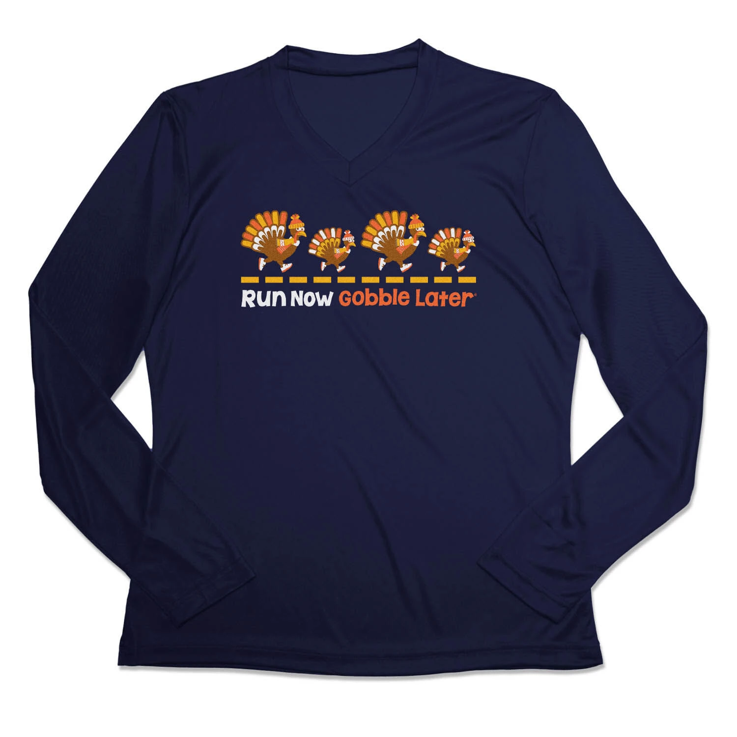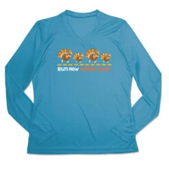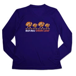 Get in the holiday spirit in our women’s long sleeve tech tee featuring a one-of-a-kind Thanksgiving design inspired by running. Our V-neck performance tee is made from 100% polyester interlock to keep runners dry and cool. The long sleeve tech tee offers a comfortable and relaxed fit that looks great with any choice of bottoms from leggings and athletic tights to jeans and longs. This stylish tech tee is perfect for everyday wear and an ideal running gift for any occasion. Any runner would love this for any turkey race.