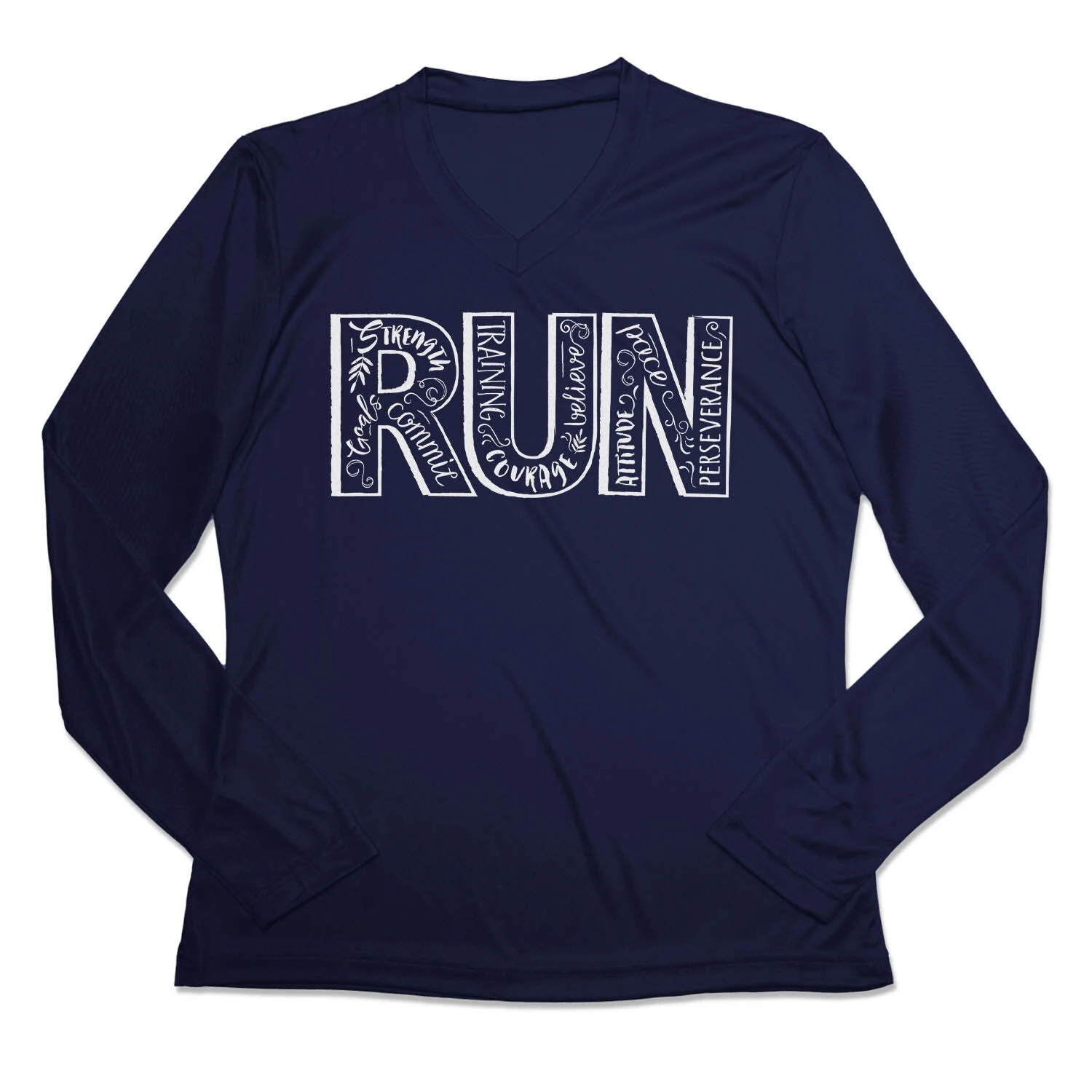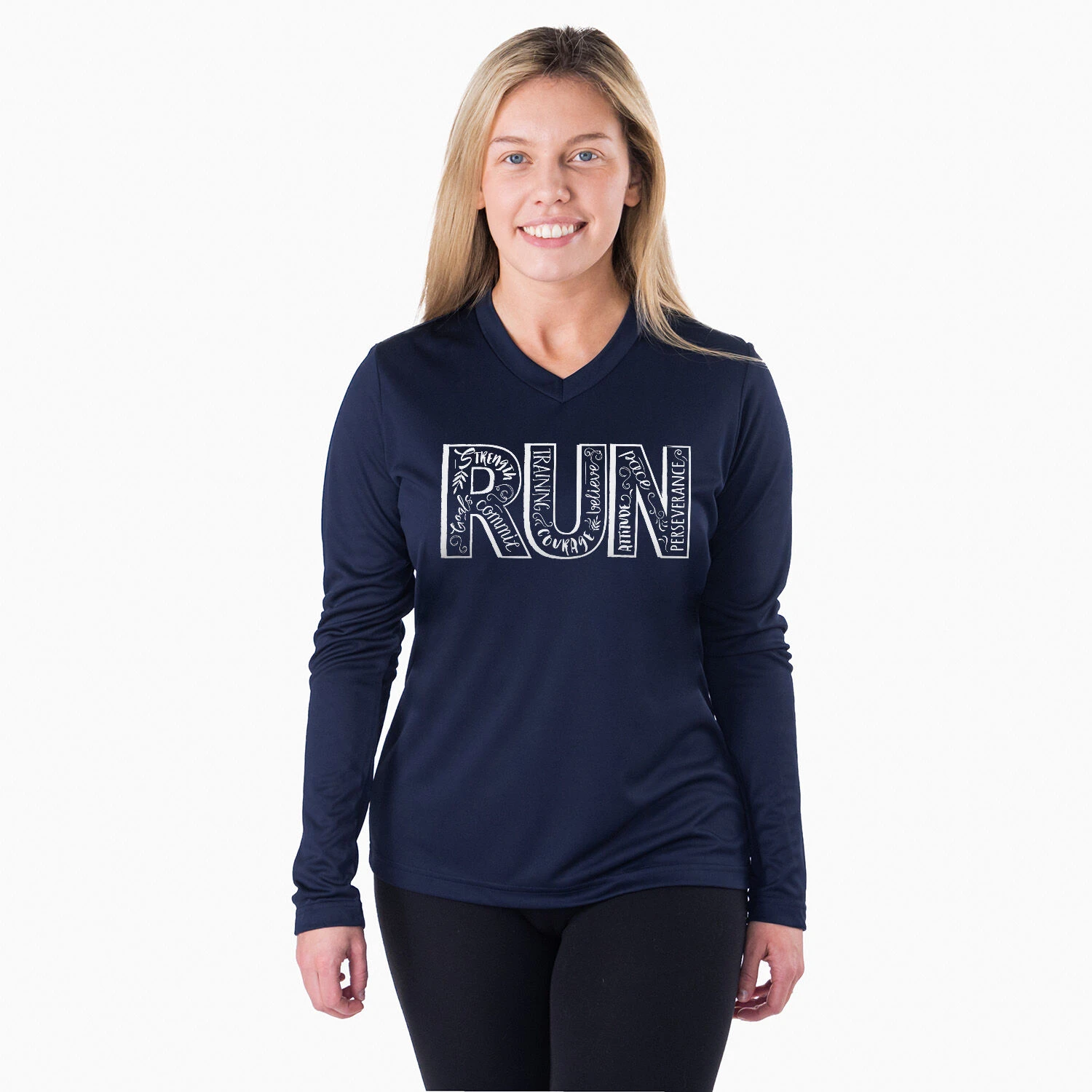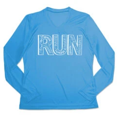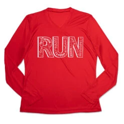 Show off your running pride in our women’s long sleeve tech tee featuring a one-of-a-kind bold design inspired by running. Our V-neck performance tee is made from 100% polyester interlock to keep runners dry and cool. The long sleeve tech tee offers a comfortable and relaxed fit that looks great with any choice of bottoms from leggings and athletic tights to jeans and longs. This stylish tech tee is perfect for everyday wear and an ideal running gift for any occasion.