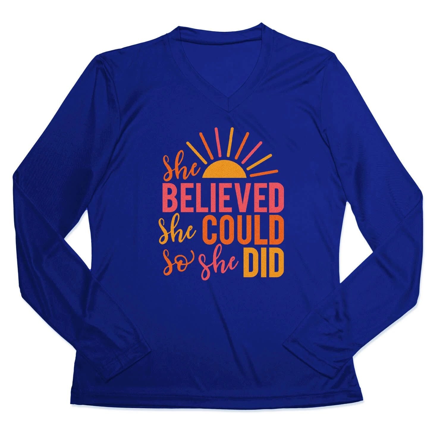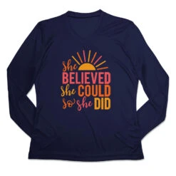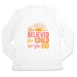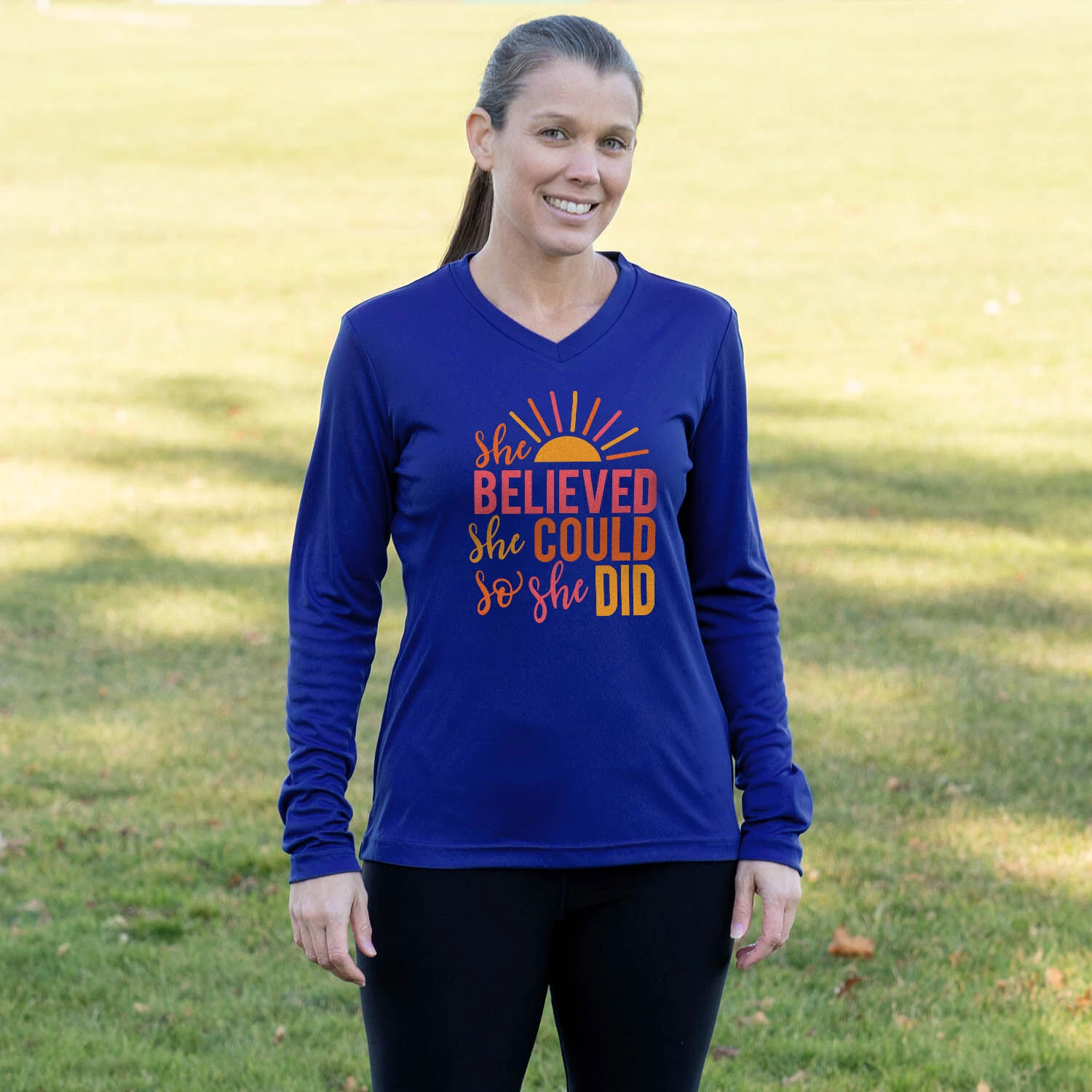 Experience the perfect blend of motivation and inspiration with our She Believed She Could So She Did women’s long sleeve tech tee. Crafted with a flattering V-neck design, this performance tee is made from 100% polyester interlock fabric, ensuring optimal moisture-wicking properties to keep runners dry and cool throughout their workouts. The long sleeves and relaxed fit of this tech tee provide ultimate comfort. With its stylish appeal and versatile functionality, this tech tee is perfect for everyday wear and an ideal gift for any female runner who embodies determination and strength.