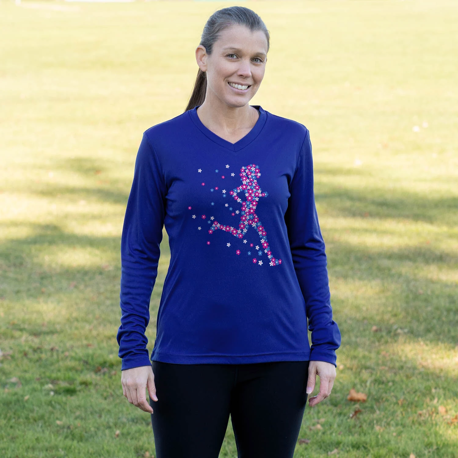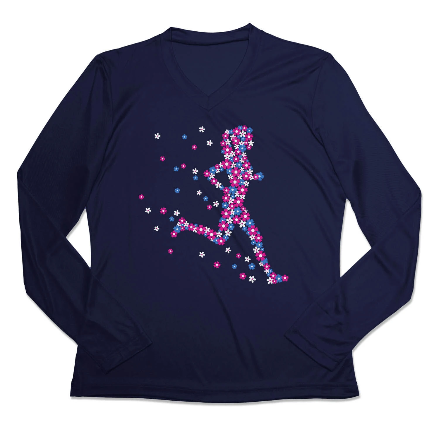 Show off your runner girl pride in our women’s long sleeve tech tee featuring our exclusive Flower Runner Girl design. Our V-neck performance tee is made from 100% polyester interlock to keep runners dry and cool. The long sleeve tech tee offers a comfortable and relaxed fit that looks great with any choice of bottoms from leggings and athletic tights to jeans and longs. This stylish tech tee is perfect for everyday wear and an ideal gift for any runner girl.