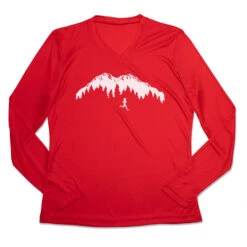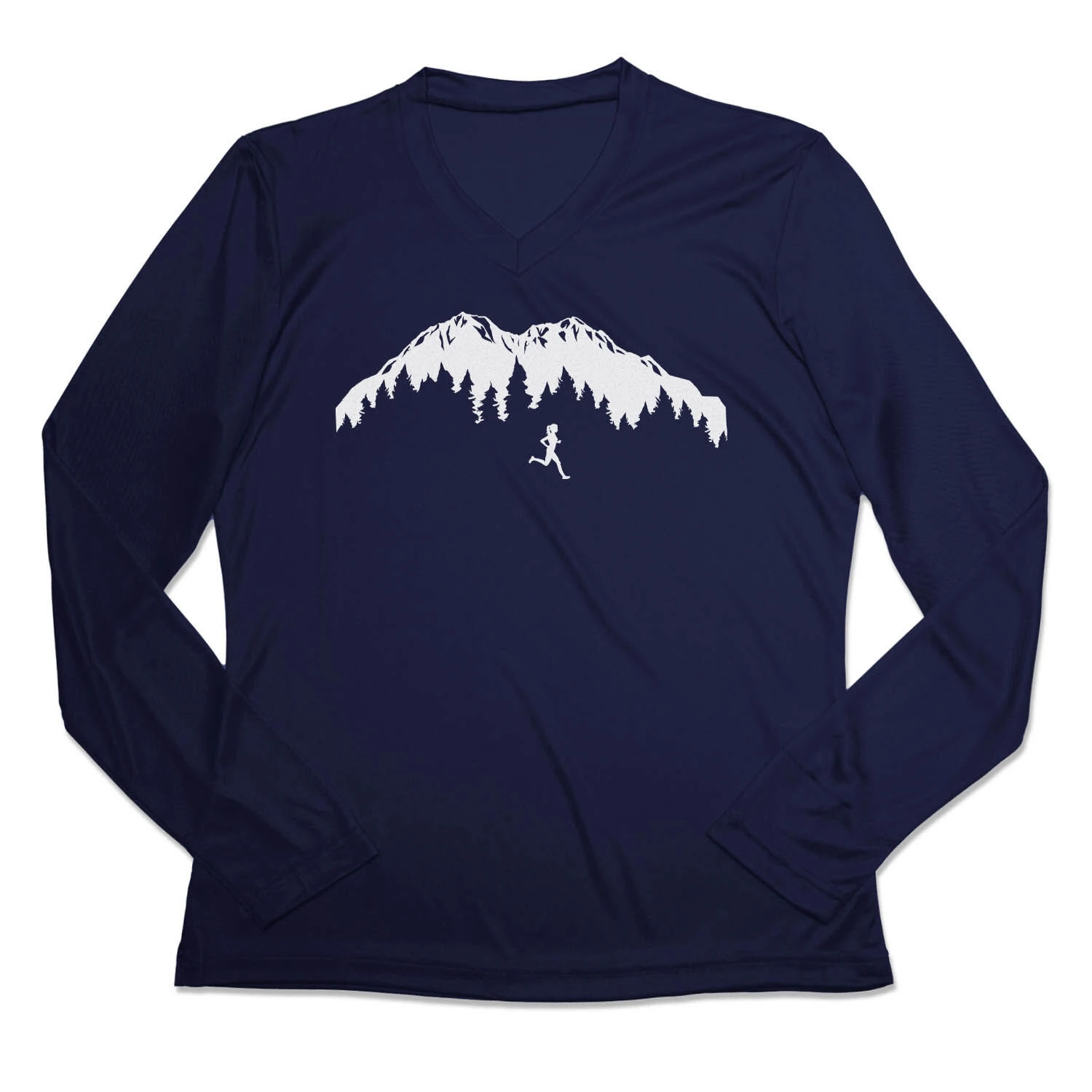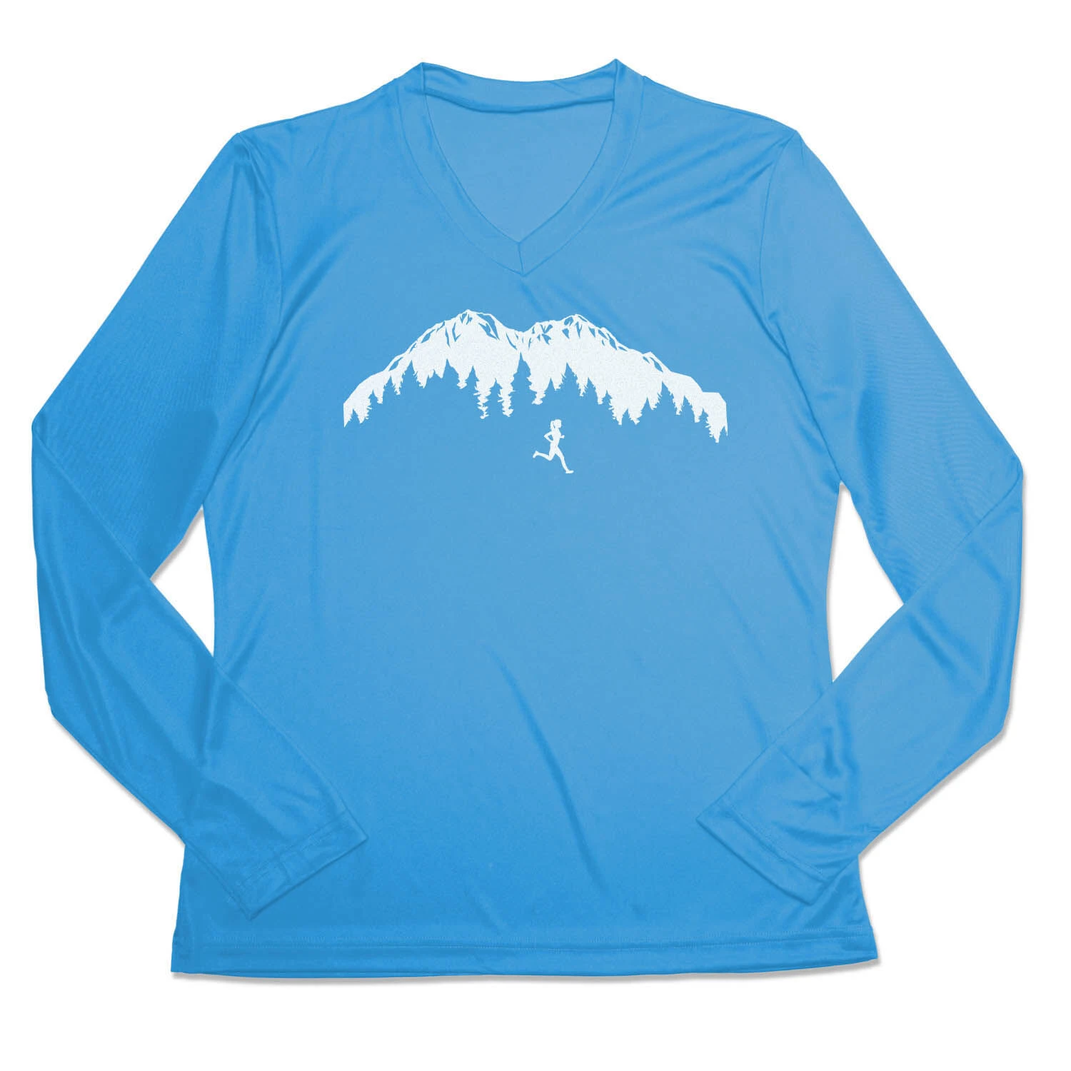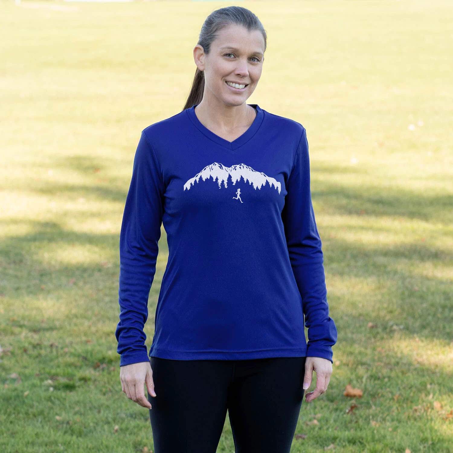Show off your trail runner pride in our women’s long sleeve tech tee featuring our exclusive Trail Runner in the Mountains design. Our V-neck performance tee is made from 100% polyester interlock to keep runners dry and cool. The long sleeve tech tee offers a comfortable and relaxed fit that looks great with any choice of bottoms from leggings and athletic tights to jeans and longs. This stylish tech tee is perfect for everyday wear and an ideal running gift for any occasion.