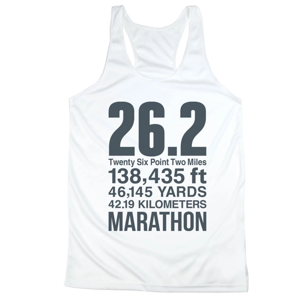 Show off your marathoner pride in our women’s racerback performance tank top featuring our exclusive 26.2 Math Miles design. Our racerback scoop neck tank is made from 100% polyester to keep runners dry and cool. This performance tank offers a comfortable and A-line fit that pairs great with any choice of bottoms from leggings and athletic tights to jeans and shorts. This stylish tank is perfect for everyday wear and an ideal running gift for any occasion.
