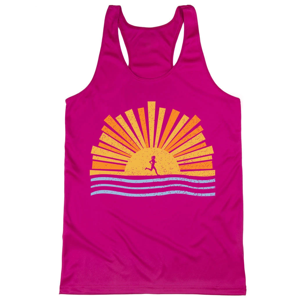 Show off your runner pride in our women’s racerback performance tank top featuring a one-of-a-kind Here Comes The Sun design. Our racerback scoop neck tank is made from 100% polyester to keep runners dry and cool. This performance tank offers a comfortable and A-line fit that pairs great with any choice of bottoms from leggings and athletic tights to jeans and shorts. This stylish tank is perfect for everyday wear and an ideal running gift for any occasion. Enjoy your sunset runs in the most comfortable tank for runners.