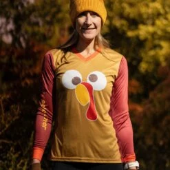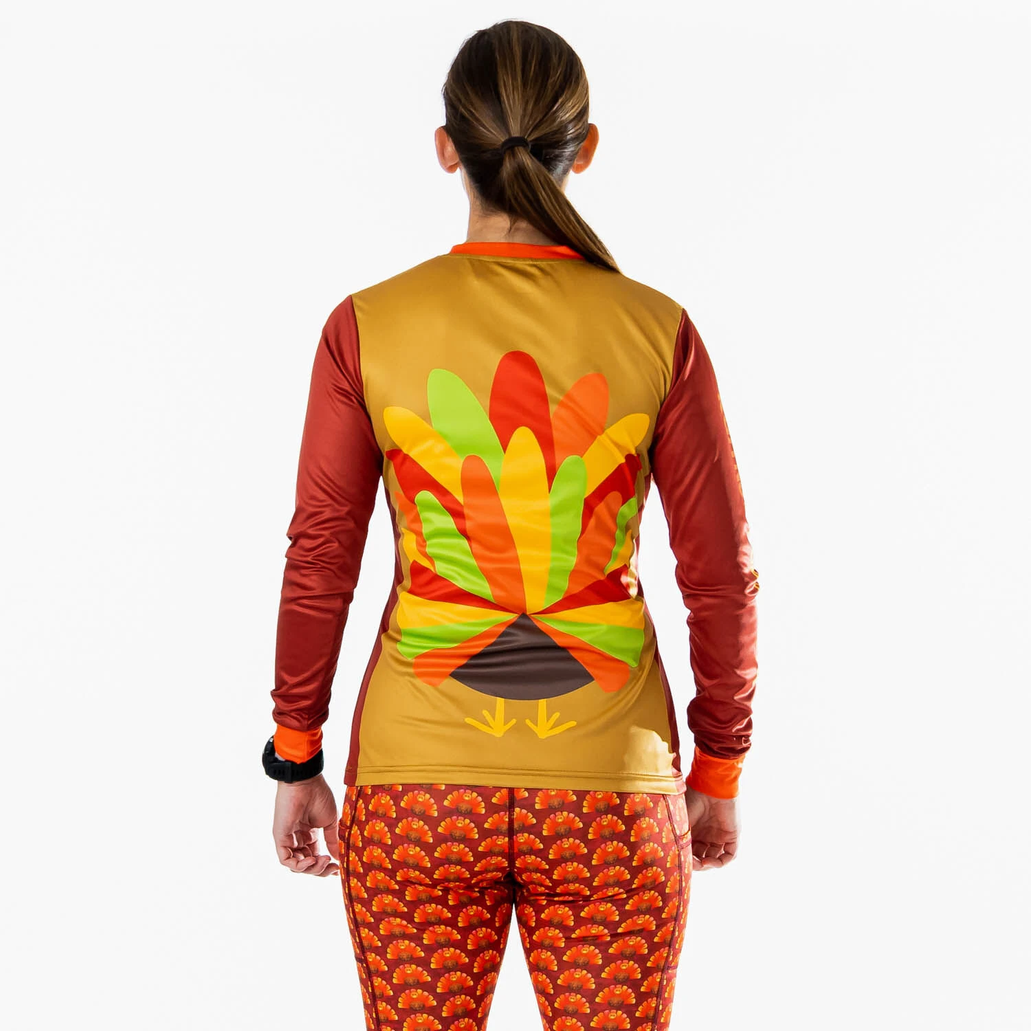 Show off your Thanksgiving spirit in our long sleeve performance tee featuring our exclusive Run Now Gobble Later design. The v-neck tee is made from moisture-wicking and lightweight material for all day comfort. Our long sleeve tech tee has a relaxed fit that looks great when paired with any choice of athletic or everyday bottoms. This stylish themed top featuring a turkey face in the front and feathers in the back is perfect for any themed races, runs, and Thanksgiving festivities.